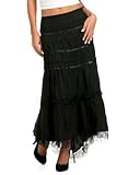 Spice up your basic black wardrobe with this long tiered skirt. Sharply detailed with a shirred band across the hip, three stripes of satin ribbon and a layer of tulle that peeks out from the assymetical handkerchief hemline. Side zip, single button/loop closure. 37" at its longest length. Cotton. Machine wash cold. This item is cut small through the hip area. (Please note for sizing: size 28 measures 36 inches at the hip. Size 32 measures 38 inches at the hip. Size 34 measures 40 inches at the hip.) more...